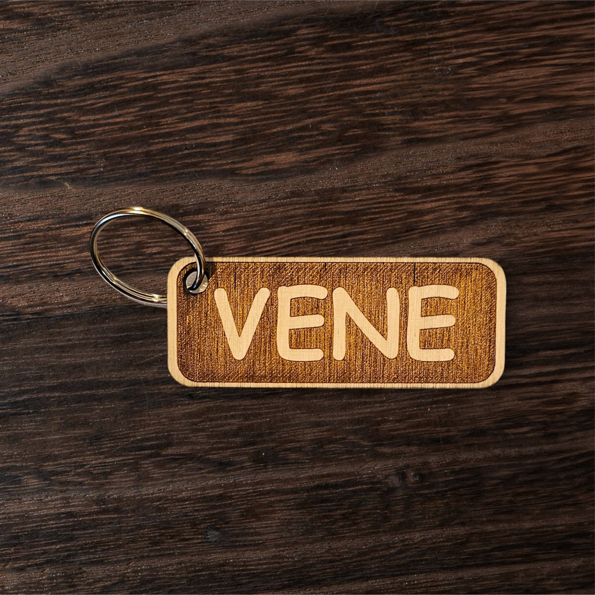 Suomalaisesta koivuvanerista laserkaivertamalla valmistettu avaimenperä.